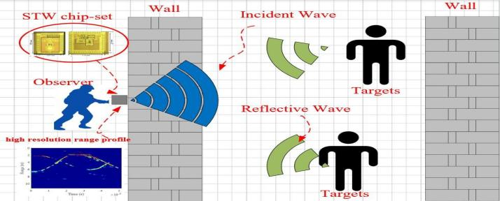 生物探测雷达通过电磁波信号,探测墙体或者其他掩蔽物后方目标的设备,通过对接收到的回波信号进行处理和分析,可以实现对隐藏在墙体后方的目标进行定位、追踪以及成像,同时也可以穿透障碍物探测到包括如心跳、呼吸等微弱信号。目前被广泛应用于军事巷战、丛林搜捕、公安反恐、搜救、非接触式医疗检测等领域。