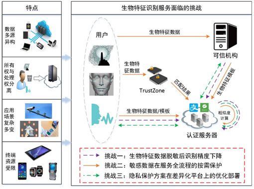 本项目源自生物特征数据安全处理的实际需求,拟解决信息化时代的个人敏感信息处理的核心安全问题。如图 1 所示,本项目面向生物特征识别服务中信息的隐私保护与安全发布痛点,形成以用户为中心的个人生物特征保护机制,解决开放共享网络环境下,生物特征信息的安全发布和使用问题,做到“脱敏分布存,多方协同用,能效平衡佳,隐私保障成”,为促进生物特征服务在移动支付、智能家居、智慧城市等领域的应用提供安全理论和技术支撑。