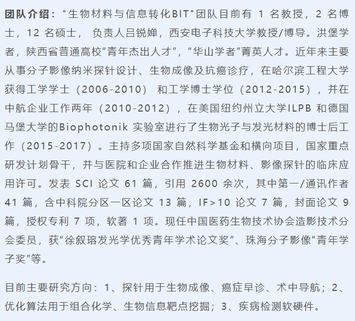 "生物材料与信息转化BIT"团队目前有 1 名教授,2 名博士,12 名硕士, 负责人吕锐婵,西安电子科技大学教授/博导。洪堡学者,陕西省普通高校“青年杰出人才”,“华山学者”菁英人才。近年来主要从事分子影像纳米探针设计、生物成像及抗癌诊疗,在哈尔滨工程大学获得工学学士(2006-2010) 和工学博士学位(2012-2015),并在中航企业工作两年(2010-2012),在美国纽约州立大学ILPB 和德国马堡大学的Biophotonik 实验室进行了生物光子与发光材料的博士后工作(2015-2017)。主持多项国家自然科学基金和横向项目,国家重点研发计划骨干,并与医院和企业合作推进生物材料、影像探针的临床应用许可。发表 SCI 论文 61 篇,引用 2600 余次,其中第一/通讯作者 41 篇,含中科院分区一区论文 13 篇,IF>10 论文 7 篇,封面论文 9 篇,授权专利 7 项,软著 1 项。现任中国医药生物技术协会造影技术分会委员,获“徐叙瑢发光学优秀青年学术论文奖”、珠海分子影像“青年学子奖”等。