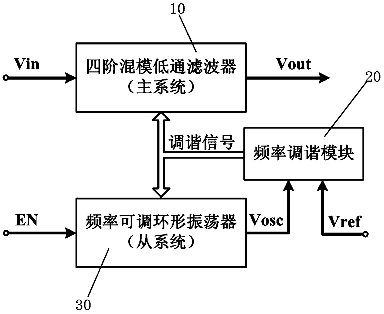 - 项目简介 本发明涉及一种截止频率自校正的混模低通滤波器,包括混模低通滤波器、环形振荡器以及频率调谐模块;混模低通滤波器由两级有源RC双二阶滤波器级联组成;环形振荡器包括或非门、第一、二反相器、电阻R5、R6以及可调电容阵列Ct,频率调谐模块包括第一、二频率计数器、比较器和累加器。上述技术方案中,基于混合使用滤波器响应模型的全差分四阶低通滤波器,在达到高阻带衰减度的同时获得良好带内平坦度;环形振荡器可消除振荡器亚稳态点的同时实现振荡频率可调功能;频率调谐模块对滤波器截止频率的实时监控和快速自动校正,极大的抑制工艺、电压、温度等波动对滤波器频率响应精确度的影响。