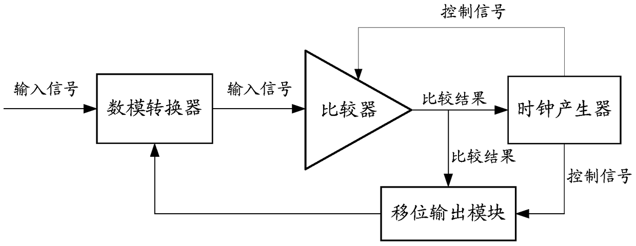 - 项目简介 本发明提供一种异步逐次逼近型模数转换器,包括由多位电容阵列组成的数模转换器,用于获取输入信号;比较器,用于比较数模转换器的输入信号,并锁存输出比较结果;移位输出模块,用于根据比较结果调整多位电容阵列中的电容的下极板电压,并在所述异步逐次逼近型模数转换器的一个转换周期内,存储比较器的所有比较结果,将存储的比较结果作为最终结果输出;异步寄存器型逐次逼近模数转换器还包括:时钟产生器,用于接收比较器输出的比较结果,并根据比较结果产生控制信号,以及通过控制信号驱动所述比较器执行比较工作;以及通过控制信号驱动移位输出模块执行调整工作。本发明的异步寄存器型逐次逼近模数转换器具有很高的工作速度。