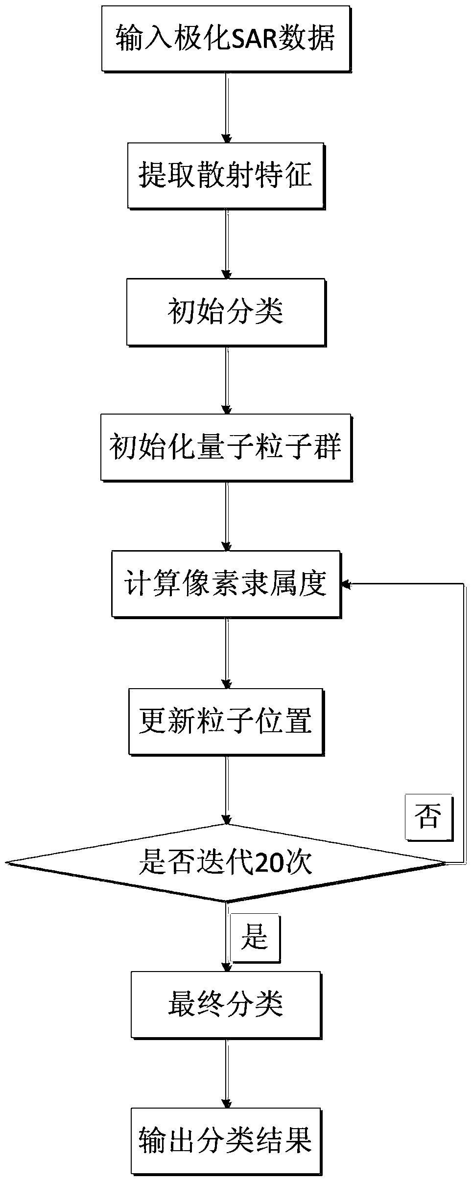 - 项目简介 本发明公开了一种基于FQPSO和目标分解的极化SAR图像分类方法,其实现步骤为:(1)输入极化合成孔径雷达SAR图像数据;(2)提取散射特征;(3)初始分类;(4)初始化量子粒子群;(5)计算像素隶属度;(6)更新粒子位置;(7)判断达到迭代结束条件;(8)最终分类;(9)输出分类结果。本发明采用对初始分类进行优化的方法,克服了现有技术对极化SAR图像数据的初始聚类中心直接进行分类,产生极化SAR图像数据分类不精确的不足,本发明可以使分类后的极化合成孔径雷达SAR图像分类精确度得到提高,可用于目标识别、极化SAR图像中不同目标的地物分类。