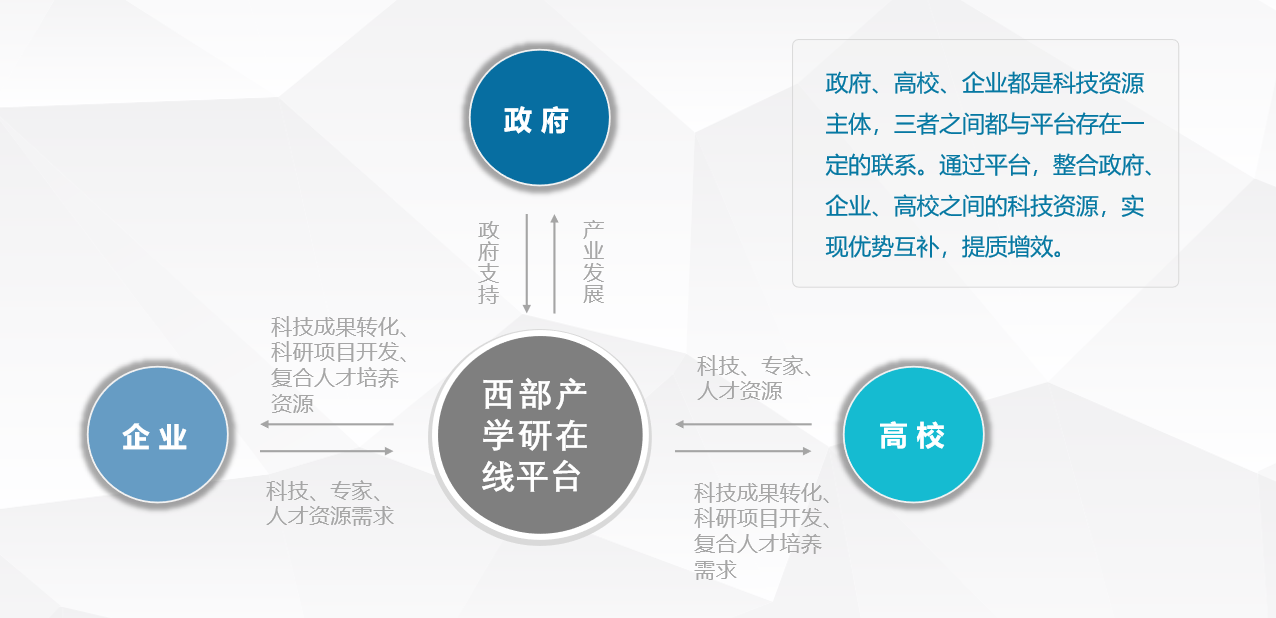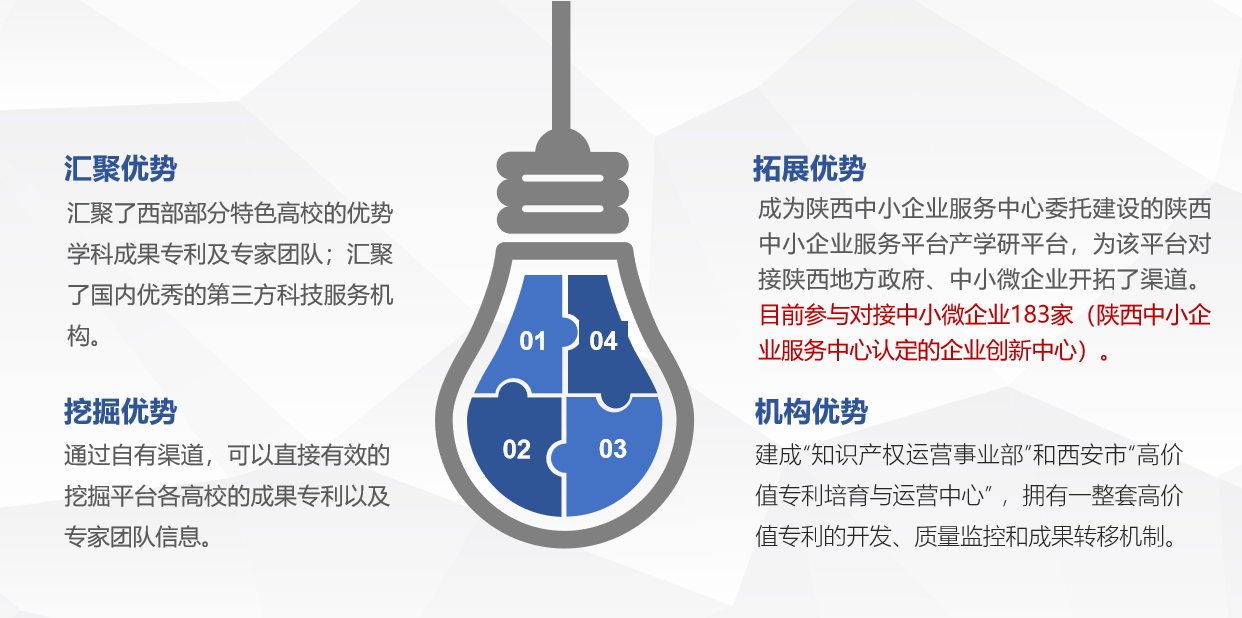 西部产学研在线平台围绕知识产权运营、科技成果转化,聚集了政府、高校、企业、科技服务机构等科技创新资源,能够实现成果供给与技术需求对接,成果转化与资本市场对接,中介服务与企业发展对接,科技资源导入科技平台(研究院、产业园、小镇)等功能,并以社交、交易等手段提高访问率、转化率的线上互联网平台。 根据“一总站多子站”及“六库八领域”框架,现已建成西部产学研在线平台,以及西北工业大学产学研在线西安石油大学产学研在线西安理工大学产学研在线西安科技大学产学研在线。 总站涵盖所有子站科技资源,子站是总站的一部分,自成体系,独立域名,独立展现所在高校、企业、政府科技资源。每个站点内容均包括六大库八大领域。目前,平台整合了学校多项优势学科专利成果资源共计8545项,各校专业学科领域知名专家教授五百余位。