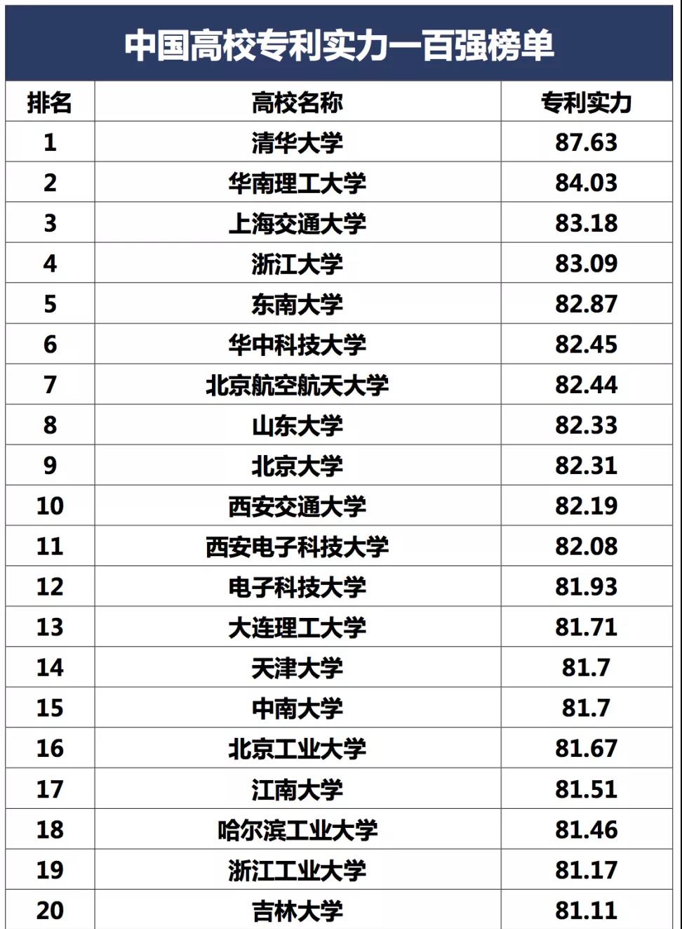 以下为中国高校专利实力100强完整榜单: